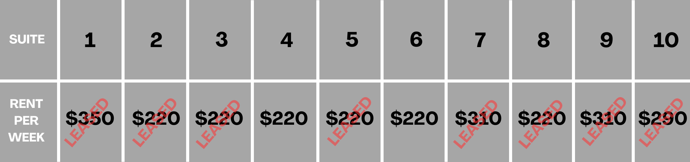 ALL PRICES ARE EXCLUSIVE OF GST / SUITES CROSSED OUT ARE CURRENTLY LEASED